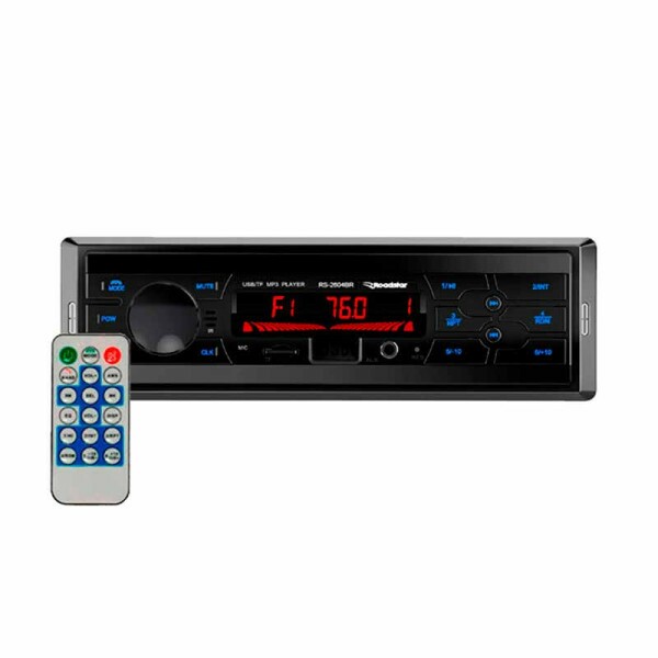 AUTO RADIO ROADSTAR FM 30W RMS - RS2604BR PLUS Avaliação: SKU.: 12495 Avise-me quando chegar Descubra mais sobre Com o auto rádio RS-2604BR Plus você curte suas músicas prediletas através de sua Rádio FM favorita, ou através do reprodutor de MP3 com troca de pastas ou até mesmo através da conexão Bluetooth. O auto rádio RS-2604BR possui entrada frontal auxiliar, entrada frontal para cartão micro SD, entrada frontal USB, conexão Bluetooth, 4 saídas RCA feitas através de um extensor e saída com conector ISO. Você pode controlar o auto rádio através do controle remoto que acompanha o aparelho*. Além disso, este modelo de auto rádio pode ser controlado também por aplicativo (via Bluetooth) através do programa CarLive disponível na APP STORE e no GOOGLE PLAY. *Aceita controle de longa distância. Informações Técnicas -Painel: Fixo com botões na cor azul -Visor: LED VERMELHO -Rádio: FM (76~108Mhz) com memória para 18 estações FM -Controles: Graves, Agudos e Balanço dos Canais -Conexões: Bluetooth -Entradas: Micro SD, Auxiliar e 1 USB -Saídas: 4 RCA -Tipo de Conector: ISO -Controle Remoto: SIM (Físico e por aplicativo) -Potência: 4 Canais de 30 Watts RMS Características Código Identificador (SKU) 12495 Voltagem 12v Garantia do Fabricante 12 meses Modelo RS2604BR PLUS Marca ROADSTAR EAN 7898587424547 NCM 85272100 Origem do Produto Estrangeira Mercado Interno - Adquirida no mercado interno