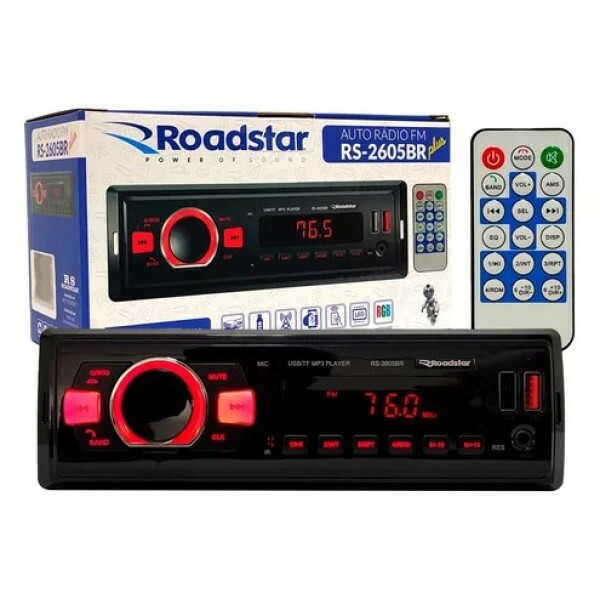AUTO RADIO ROADSTAR FM 48W RMS - RS2605BR PLUS Avaliação: SKU.: 14336 AUTO RADIO ROADSTAR FM 48W RMS - RS2605BR PLUS is available for purchase in increments of 1 Faça Login ou Cadastre-se para comprar Descubra mais sobre Praticidade Com o auto rádio RS-2605BR Plus você curte suas músicas prediletas através de sua Rádio FM favorita, ou através do reprodutor de MP3 com troca de pastas ou até mesmo através da conexão Bluetooth. Conectividade O auto rádio RS-2605BR Plus possui entrada frontal auxiliar, entrada frontal para cartão micro SD, 2 entradas frontais USB sendo uma para você escutar suas músicas preferidas pelo Pen Drive e outra para recarregar seu celular e conexão Bluetooth. Controle total em suas mãos Você pode controlar o auto rádio através do controle remoto que acompanha o aparelho*. Além disso, este modelo de auto rádio pode ser controlado também por aplicativo (via Bluetooth) através do programa CarLive disponível na APP STORE e no GOOGLE PLAY. *aceita controle de longa distância. Informações Técnicas Painel: Fixo com botões em 7 cores de iluminação (azul, azul claro, branco, amarelo, vermelho, roxo e verde) Visor: LED VERMELHO Rádio: FM (76~108Mhz) com memória para 18 estações FM Controles: Graves, Agudos e Balanço dos Canais Conexões: Bluetooth Entradas: Micro SD, Auxiliar e 2 USB´s (1 Charger e 1 Player) Saídas: 4 RCA Tipo de Conector: ISO Controle Remoto: SIM (Físico e por aplicativo) Potência: 4 Canais de 48 Watts RMS Conteúdo da embalagem: 01 Auto Rádio RS-2605BR Plus 01 Controle Remoto 01 Chicote alimentação (ISO Conector) 01 Chicote de audio (ISO Conector) Manual e Certificado de Garantia Características Código Identificador (SKU) 14336 Voltagem 12v Garantia do Fabricante 12 meses Modelo RS2605BR PLUS Marca ROADSTAR EAN 7898587424998 NCM 85272100 Origem do Produto Estrangeira Mercado Interno - Adquirida no mercado interno