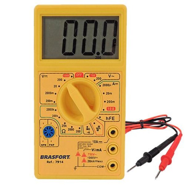 MULTIMETRO DIGITAL BRASFORT DISPLAY 2,5" COM SINAL SONORO DE CONTINUIDADE ''BIP'' - 7914 Avaliação: SKU.: 10048 MULTIMETRO DIGITAL BRASFORT DISPLAY 2,5" COM SINAL SONORO DE CONTINUIDADE ''BIP'' - 7914 is available for purchase in increments of 1 Faça Login ou Cadastre-se para comprar Descubra mais sobre O multímetro digital é um equipamento delicado e requer o manuseio de um operador habilitado tecnicamente, caso contraria, poderá ser danificado. Portanto não serão considerados, mesmo dentro do prazo de validade da garantia, os defeitos causados pelo mau uso. Multímetro digital com visor em cristal liquido 2.5’’ Medição de tensão continua e alternada, corrente continua, resistor, transistores e diodos Ideal para laboratórios, oficinas, bricolagem e uso doméstico Composição: Carcaça em PVC, visor de cristal liquido, lente de acrílico e placa integrada de circuito impresso com diversos componentes Validade Indeterminada Garantia: 01 ano para defeitos de fabricação ou material Tamanho do Produto: 2,5 x 12,5 x 7 cm Informações Técnicas: -Funções e escalas de precisão: -Tensão continua (DCV): 200mV, 2.000mV, 20V, 200V e 1.000V -Tensão Alternada (ACV): 200V e 750V -Corrente Continua (DCA): 2.000, 20mA e 10ª -Resistor:(Ω) 200Ω, 2.000Ω, 20kΩ, 200kΩ, 2.000kΩ -Transistores (hFe) NPN e PNP -Diodos: P/N Características Código Identificador (SKU) 10048 Garantia do Fabricante 12 meses Marca BRASFORT EAN 7899807213842 Origem do Produto Nacional