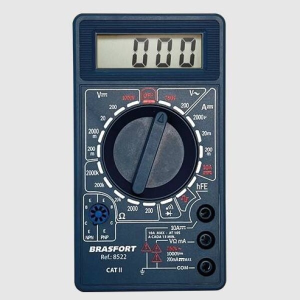 MULTIMETRO DIGITAL BRASFORT DT-830 COM SINAL SONORO DE CONTINUIDADE ''BIP'' - 8522 Avaliação: SKU.: 5721 MULTIMETRO DIGITAL BRASFORT DT-830 COM SINAL SONORO DE CONTINUIDADE ''BIP'' - 8522 is available for purchase in increments of 1 Faça Login ou Cadastre-se para comprar Descubra mais sobre Medição de corrente contínua, tensão alternada e contínua, resistência elétrica, polarização de transistor e teste de continuidade. Carcaça em PVC na cor amarela, visor de cristal líquido, lente de acrílico e placa integrada de circuito impresso com diversos componentes. Informações Técnicas: Funções: Tensão contínua, tensão alternada, corrente contínua, teste de diodos, teste de transistores, resistência, sinal Sonoro de continuidade ESCALAS DE MEDIÇÃO POR GRANDEZA: Tensão Contínua(DCV): 200mV,2000mV,20V,200V e 1000V Tensão Alternada(ACV): 200V e 750V Corrente Contínua(DCA): 2000 uA, 20mA, 200mA e 10A Resistência(ohm): 200ohm, 2000ohm, 20kohm, 200kohm e 2000kohm Transistores(hFe): NPN e PNP Diodos: P/N Características Código Identificador (SKU) 5721 Garantia do Fabricante 12 meses Modelo DT-830 Marca BRASFORT EAN 7898094335220 Origem do Produto Estrangeira Mercado Interno - Adquirida no mercado interno