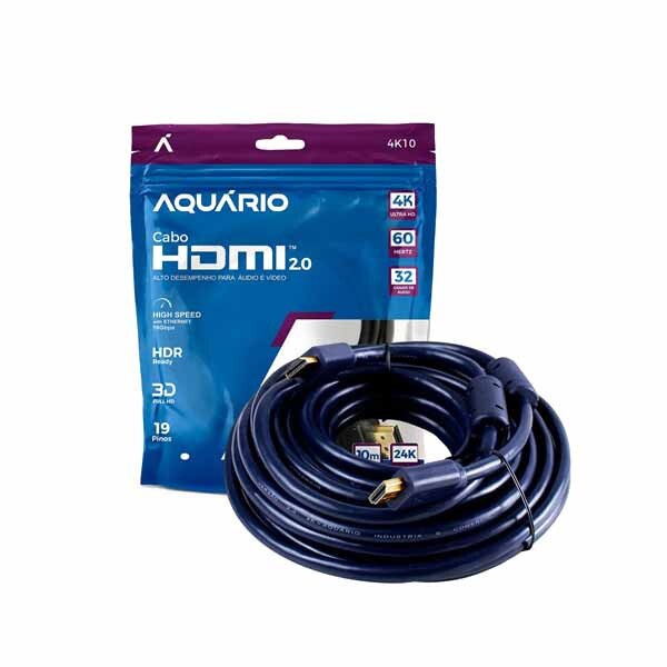 CABO HDMI AQUARIO 2.0 4K ULTRA HD 3D 10M COM FILTRO - 4K10 Avaliação: SKU.: 13474 CABO HDMI AQUARIO 2.0 4K ULTRA HD 3D 10M COM FILTRO - 4K10 is available for purchase in increments of 1 Faça Login ou Cadastre-se para comprar Descubra mais sobre Trazendo mais qualidade de som e imagem para seus equipamentos favoritos, dê o que ele merece! Cabo HDMI Aquário com resolução até 4K. Aproveite o grande comprimento para tornar flexível qualquer instalação de áudio e vídeo que precise percorrer longos metros, assim como lojas com televisores, para mídia indoor, escritórios e salas de reunião e muitas outras finalidades. Se precisa percorrer uma distância maior até o monitor ou TV é ã opção ideal! A versão 2.0 além de chegar a uma taxa de 16Gbps, possui alta blindagem para evitar qualquer tipo de interferência, além de ser compatível com proporção de cinema (21:9). Com resolução máxima em 4K de 4096x2048 a uma taxa de quadros em 60Hz, traz muito mais fluidez que a tecnologia anterior, na Versão 1.4. A diferença entre a qualidade de imagem normal e em full HD é muito grande, principalmente para quem precisa ter fidelidade e rapidez na hora de transmitir uma apresentação, fotos ou vídeos. Para conseguir garantir 36 meses de garantia com um grande comprimento, o cabo tem uma ótima resistência, blindagem em sua capa, além de ter os fios inteiramente em cobre. Tudo isso você encontra em todos modelos de Cabos HDMI Aquário. Você pode conectar qualquer aparelho, seja um video game, smart tv box, home theater, computador, DVD, etc. Ele é compatível com a tecnologia ARC para ser utilizada com transferência de áudio, o cabo perfeito pra conectar o seu Home Theater na TV utilizando apenas 1 Cabo HDMI pela porta ARC de mesmo nome. Características do cabo: -18 Gbps alta velocidade de largura de banda -2160p, HDR Ready e 3D em Full HD -Conector revestido em ouro -Ponta livre de oxigênio e com 19 pinos -Som imersivo com até 32 canais de áudio Informações Técnicas: -Código do Produto: 4K10 -Comprimento: 10 metros -Versão: 2.0 - 60 Hz -Canal de retorno de Áudio: ARC -Resolução: 4K (4096 x 2160p) -Conectores: Banhados a ouro com 19 pinos -Garantia: 3 anos -Peso: 585 g Características Código Identificador (SKU) 13474 Garantia do Fabricante 12 meses Marca AQUARIO Cor Preto EAN 7898127608574 NCM 85442000 Origem do Produto Nacional
