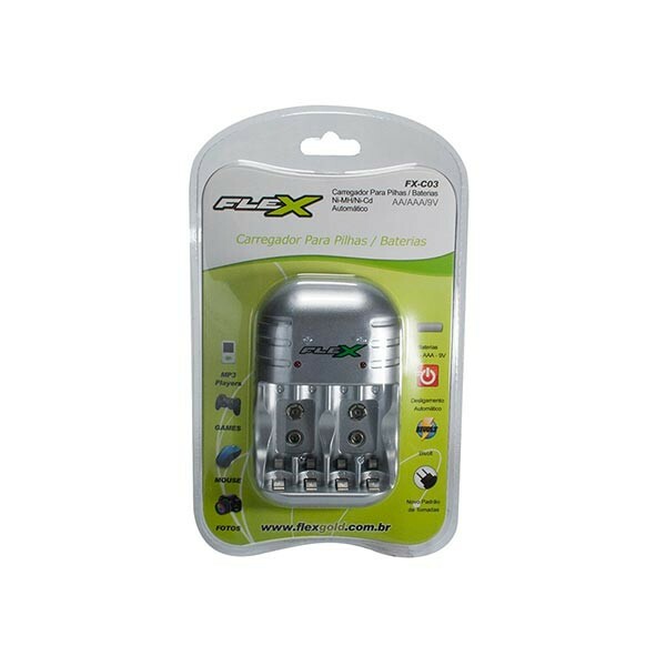 CARREGADOR PARA PILHAS FLEX GOLD AA/ AAA/ 9V BIV AUTO STOP - FX-C03 Avaliação: SKU.: 13598 Avise-me quando chegar Descubra mais sobre -Carrega 2 – 4 baterias recarregáveis AA/AAA ou 1 – 2 baterrias 9V simultaneamente -3 funções de segurança -Monitoramento de voltagem -Microprocessador que controla o modo ideal de carga -Proteção contra curto-circuito -LED apaga ao término da carga -Desligamento automático 2 canais de cargas independentes -Bivolt automático (AC 100V-240V) Características Código Identificador (SKU) 13598 Voltagem Bivolt Garantia do Fabricante 6 meses Modelo FX-C03 Marca FLEX GOLD EAN 7898615159021 NCM 85044021 Origem do Produto Estrangeira Mercado Interno - Adquirida no mercado interno