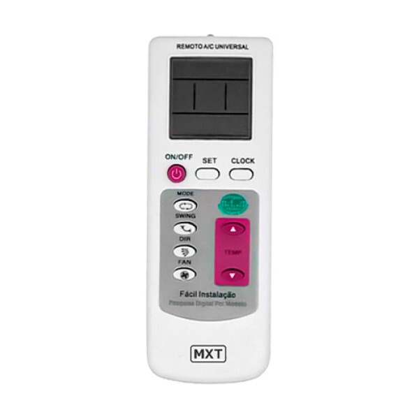CONTROLE PARA AR CONDICIONADO UNIVERSAL INTELIGENTE ONE TOUCH - MXT-CO1310 Avaliação: SKU.: 7965 CONTROLE PARA AR CONDICIONADO UNIVERSAL INTELIGENTE ONE TOUCH - MXT-CO1310 is available for purchase in increments of 1 Faça Login ou Cadastre-se para comprar Descubra mais sobre Controle remoto para ar condicionado universal One Touch; Código MXT: CO1310; Marca compatíveis: - Carrier: 088; - Electrolux: 060, 089, 158-163; - Fujitsu: 040, 046-050, 139-141; - Gree: 066, 067,086,108,109,142-144; - Hitachi: 058,135-13; - Hyundai: 002,060,112-114; - LG: 077,122,131-1348; - Midea: 001,056,078,079,164,165; - Mitsubishi: 059,060,092,110,111; - NEC: 015,037,063,081; - Panasonic: 061,062,104,105; - Philco: 076; - Samsung: 036,039,068,069,145-147; - Sanyo: 015-037; - Sharp: 051,055,080; - TLC: 002,007,060,195; - Toshiba: 056,057; - York: 056,066,085,107,108,196,197; Características Código Identificador (SKU) 7965 Garantia do Fabricante 6 meses Modelo CO1310 Marca MXT EAN 7899903117884 Origem do Produto Estrangeira Mercado Interno - Adquirida no mercado interno