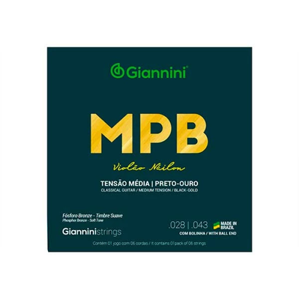 ENCORDOAMENTO PARA VIOLAO NAILON 6 CORDAS GIANNINI MPB FOSFORO BRONZE GENWBG PRETO-OURO MEDIA - 5930 Avaliação: SKU.: 11432 Avise-me quando chegar Descubra mais sobre A série MPB apresenta toda a sonoridade que a nossa música brasileira pede. O encordoamento para violão náilon Giannini MPB GENWBG é indicado para músicos que gostam de cordas com uma pegada média. Produzidas em náilon preto-ouro, o modelo GENWBG tem tensão média. Todos os encordoamentos Giannini são produzidos no Brasil, em nossa fábrica em Salto, interior de São Paulo. - Fósforo Bronze Formado na sua composição por 92% de Cobre, 8% de Estanho e um residual de Fósforo é um metal avermelhado. Nas cordas musicais produzem som aveludado, grave e quente, com maior durabilidade. - Selo de Qualidade ISO 9001 Toda a linha de encordoamentos Giannini conta com a aprovação do selo de qualidade ISO 9001. Mas o quê é o selo ISO 9001? ISO 9001 é uma série de normas e regras que buscam garantir a qualidade final do seu encordoamento. Estes procedimentos englobam desde a escolha da matéria-prima e seus fornecedores, passando por todo o processo de produção dos encordoamentos, capacitação da mão-de-obra envolvida na produção, sua distribuição, até o produto chegar ao lojista e às mãos do consumidor. Estes processos e todos os envolvidos nele passam por auditorias todos os anos, para verificar se estão sendo seguidos de acordo com a norma estabelecida, para que o selo seja renovado. Desde 2007 a Giannini conta com o selo ISO 9001 em sua linha de encordoamentos, sendo renovado anualmente e comprovando a qualidade de cada encordoamento que chega à suas mãos e aos seus instrumentos. Informações Técnicas: - Fabricação: Brasil - Alma: Náilon - Revestimento: Bronze Fosforoso - Acabamento: Bolinha - Cordas primas em náilon preto - Comprimento de escala: 648 mm / 25 1/2″ Características Código Identificador (SKU) 11432 Garantia do Fabricante 3 meses Marca GIANNINI EAN 7898159186842 Origem do Produto Nacional