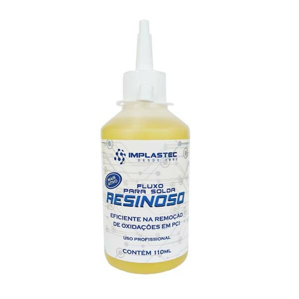 FLUXO PARA SOLDA IMPLASTEC RESINOSO 110ML - PAFR011060 Avaliação: SKU.: 13255 FLUXO PARA SOLDA IMPLASTEC RESINOSO 110ML - PAFR011060 is available for purchase in increments of 1 Faça Login ou Cadastre-se para comprar Descubra mais sobre Por ser mais ativo em relação aos fluxos comuns, atua na remoção de oxidações em placas de circuito impresso (PCI), além de melhorar a molhabilidade do metal na região em que se deseja soldar. Principais Aplicações: Soldagem pelo processo de estanhagem, quando há a necessidade de uma ação mais incisiva sobre as oxidações. Manuseio e Método de Aplicação: Aplique o Fluxo Resinoso Implastec nos pontos a serem soldados, aqueça a ilha de soldagem e efetue a solda do componente. Efetue a limpeza da placa eletrônica com o Álcool Isopropílico Implastec. Armazenagem: Armazenar o produto vedado, longe do calor, em local seco, ao abrigo da luz, bem ventilado, e em temperatura ambiente. Mantenha o produto em sua embalagem original. Não reutilizar a embalagem vazia. Observações: As informações e dados contidos neste boletim correspondem aos nossos conhecimentos atuais coligidos por pessoal técnico capacitado e confiável. Devem ser tomados como orientação e não como especificação garantida. Em qualquer caso de uso, o cliente deverá testar o desempenho contando com informações que possamos fornecer. Indicações de uso não são sugestões para se infringir patente ou legislação. Uma vez que não temos controle sobre o uso por terceiros, nossa responsabilidade se limita apenas ao nosso produto. Características Código Identificador (SKU) 13255 Garantia do Fabricante 12 meses Marca IMPLASTEC EAN 7898446731137 NCM 38249941 Origem do Produto Nacional