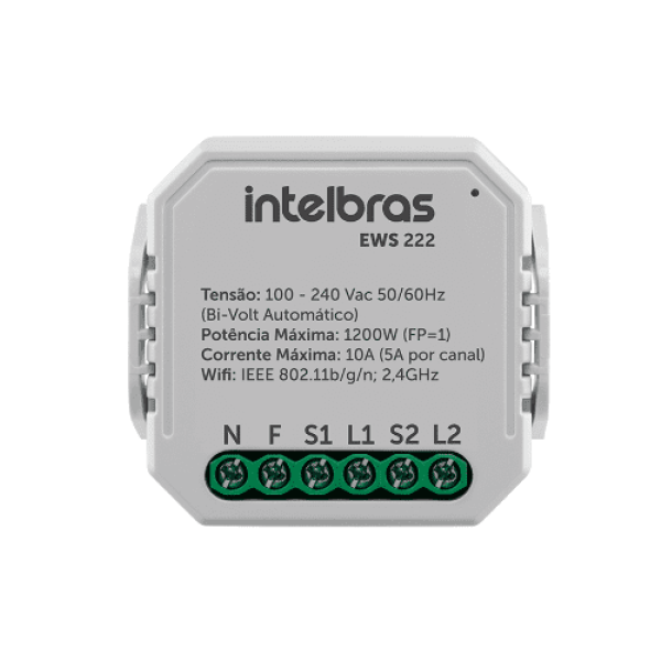 MINICONTROLADOR INTELBRAS SMART WI-FI PARA 2 INTERRUPTORES EWS 222 - 4850006 - FR Avaliação: SKU.: 13781 MINICONTROLADOR INTELBRAS SMART WI-FI PARA 2 INTERRUPTORES EWS 222 - 4850006 - FR is available for purchase in increments of 1 Faça Login ou Cadastre-se para comprar Descubra mais sobre Compatível com Alexa e Google Assistente. Compatível com app e Izy Smart. Variação da intensidade da Luz. Torne sua casa inteligente de forma discreta O minicontrolador smart é ideal para embutir em caixa 4×2, tornando ambientes discretos e inteligentes. Compatível com interruptor Aciona a iluminação de até 2 cenários diferentes, simultaneamente, via app ou comando de voz, sem perder a funcionalidade do interruptor. Programe rotinas de acionamento Controle a iluminação, simulando presença ou programando lâmpadas como despertador, ou acione ventiladores e cafeteiras remotamente. Tenha controle compartilhado Cadastre até 10 usuários no aplicativo Izy e utilize o dispositivo com sua família. Especificações técnicas Tensão de alimentação 100 ~ 240 Vac (bivolt automático) 50/60 Hz Corrente máxima 10 A (FP = 1) Potência máxima de carga 1.200 W (FP = 1) Consumo 1,2 W Número de interruptores (canais) 2 Conexão elétrica Fase (F), Neutro (N), Carga 1 (L1), Carga 2 (L2), Interruptor 1 (S1), Interruptor 2 (S2) Bitola máxima de fio 1,5 mm² Conectividade Wi-Fi IEEE 802.11b/g/n 2,4 GHz Wi-Fi - distância máxima do roteador 15 a 20 m sem obstáculos App Izy Smart – sistemas compatíveis iOS 9.0 ou superior, Android™ 4.4 ou superior intelbras.com.br Fotos do produto Cenário de aplicação Ilustração de instalação com EWS 222 – mini controlador smart de 2 canais Imagens meramente ilustrativas Android e Google são marcas registradas da Google LLC. Amazon, Alexa e todos os logotipos relacionados são marcas registradas da Amazon.com, Inc e suas afiliadas. Material Plástico com proteção antichama Local de instalação Ideal para embutir em caixa 4×2”, acompanha suporte para instalação em trilho DIN (não indicado para instalação dentro de quadro metálicos) Temperatura de operação 0 a 40 °C Dimensão do produto (L × A × P) – com suporte para trilho DIN 50,5 × 46 × 19 mm Peso do produto – com suporte para trilho DIN 46 g Características Código Identificador (SKU) 13781 Garantia do Fabricante 12 meses Marca Intelbras EAN 7899298606475 NCM 85365090 Origem do Produto Estrangeira Mercado Interno - Adquirida no mercado interno
