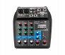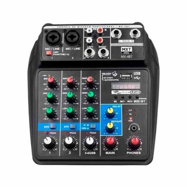 MESA DE SOM MXT 4 CANAIS BALANCEADA PHANTOM POWER EFX USB BLUETOOTH MX-4BT - 054.0001.00130 Avaliação: SKU.: 9550 Avise-me quando chegar Descubra mais sobre - Este é um mixer de 4 canais multi-função com placa de som que busca atender a necessidade de usuarios de produção de música em home studio, webcast, apresentações musicais entre outras necessidades. - Conexão BLUETOOTH - Recursos: O mixer contém ajuste de ganho de entrada e de equalização de graves e agudos, alimentação 48V Phantom Power para uso em microfones condensadores, saída P2 de alta definição para conexão de fones de ouvido, MP3 player e também pode ser usado como placa de som para PC através de conexão USB. Mixer compacto, leve, e que pode ser alimentado pelo USB do PC sem a necessidade nenhuma outra fonte de energia. Se preferir, você também pode usar o adaptador de energia portátil USB AC / DC. - 2 Entradas Cannon / P10 Alimentação Phantom Power +48V - Interface USB de Áudio para PC - Saída analógica estéreo para gravação - Alimentação via usb / fonte bi-volt (127/220v) - Equalizador de 2 bandas por canal - Monitoração por fone de ouvido - Módulo de efeitos EFX - Conexão MP3 / Pendrive USB Informações Técnicas: - Modelo: MX-4BT - Total distorção harmônica: <0,1% - Resposta de frequência: 20Hz ~ 20KHz / ± 0.5dB - Relação S/N: >-80dB - Max. saída: 4V / Max. Impedância de entrada e saída: - Microfone 2,4 Kohms - Mono 11Kohms - Estéreo 100Kohms EQ paramétrico: - HI: 12KHz ± 15dB - BAIXO: 80Hz / ± 15dB Seção Mixer: - Sensibilidade do Canal de Entrada: - Mic: -60dB - Entrada canal estéreo: -40dB - EFX Envio: -20dB - EFX Retorno: -20dB Características Código Identificador (SKU) 9550 Garantia do Fabricante 6 meses Marca MXT EAN 7899903148710 Origem do Produto Nacional