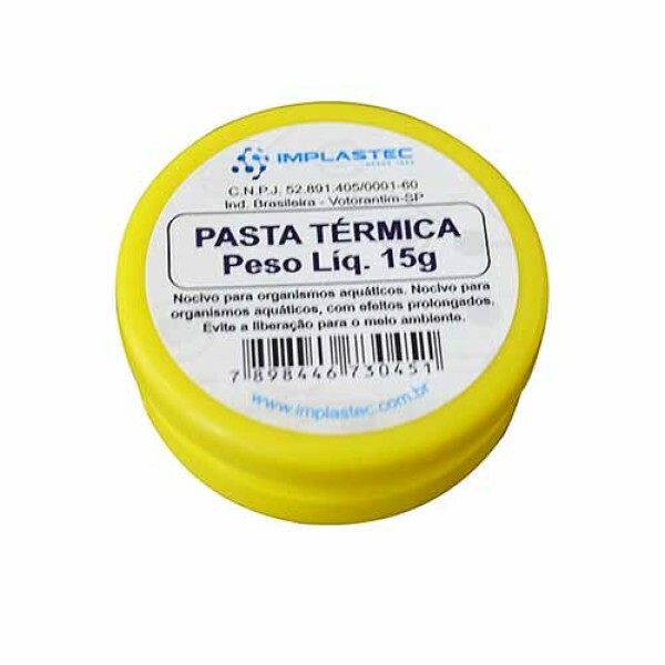 PASTA TERMICA IMPLASTEC POTE 15G - PAPT1530CX Avaliação: SKU.: 13271 PASTA TERMICA IMPLASTEC POTE 15G - PAPT1530CX is available for purchase in increments of 1 Faça Login ou Cadastre-se para comprar Descubra mais sobre A IPT é amplamente utilizada nas montagens de semicondutores e demais componentes onde haja necessidade de eliminação eficiente do calor gerado. Além da montagem de semicondutores, a IPT tem sido usada, com sucesso, para melhorar o tempo de resposta de termopares e de termoresistências, em sistemas de medição de temperatura, como pasta condutiva em trocadores de calor de sistemas de refrigeração, em acoplamento térmico das resistências dos canhões da injetora de plástico, entre outros. Modelos: A pasta térmica implastec são produzidas nas consistências NGLI 2 e 3. Características: -Penetração: (265-295) ou (220-250) (1/10 mm); -Exudação: 0,4%; -Componente Básico: Silicone de alto peso molecular; -Condutividade térmica: 0,4 w/mk (conforme norma técnica ISO 8301:1991); -Ponto de gota: Inexistente; -Cor: Branca (levemente brilhante); -Solubilidade em água: 0,04g / 100mL; Transporte e Armazenagem: A IPT deve ser transportada e armazenada conforme prática comum com produtos químicos. Verifique a classificação deste produto antes de transportá-lo. Manuseio e Método de Aplicação: A IPT pode ser facilmente aplicada com o auxílio de espátula, pincel ou via bombeamento pneumático. Durante a aplicação, recomenda-se a utilização de óculos de segurança. Nunca reutilize as embalagens para outros fins. Observações: As informações e dados contidos neste boletim correspondem aos nossos conhecimentos atuais coligidos por pessoal técnico capacitado e confiável. Devem ser tomados como orientação e não como especificação garantida. Em qualquer caso de uso, o cliente deverá testar o desempenho contando com informações que possamos fornecer. Indicações de uso não são sugestões para se infringir patente ou legislação. Uma vez que não temos controle sobre o uso por terceiros, nossa responsabilidade se limita apenas ao nosso produto. Características Código Identificador (SKU) 13271 Garantia do Fabricante 12 meses Marca IMPLASTEC EAN 7898446730451 NCM 29319029 Origem do Produto Nacional