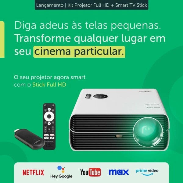 PROJETOR INTELBRAS FULL HD 3800 LUMENS 40 A 150 POLEGADAS + SMART BOX TV STICK PFLS410 - 4290054 - FR Avaliação: SKU.: 14231 PROJETOR INTELBRAS FULL HD 3800 LUMENS 40 A 150 POLEGADAS + SMART BOX TV STICK PFLS410 - 4290054 - FR is available for purchase in increments of 1 Faça Login ou Cadastre-se para comprar Descubra mais sobre Projetor e Smart TV Stick Full HD Tenha uma experiência de cinema onde você estiver. Assista suas séries e filmes favoritos com imagens de 150” e resolução Full HD. Experimente a solução Smart Viva toda a experiência do cinema, desfrutando do melhor dos streamings no conforto da sua casa, ou onde você quiser. Projeção de até 150” Nosso projetor cabe em qualquer situação, expanda ainda mais a sua criatividade, transformando as suas ideias em realidade. Resolução Full HD Não perca nenhum detalhe das imagens com a qualidade Full HD e alta resolução com até 120” polegadas que garante cores e contraste de alto nível. Explore todas as possibilidades Compartilhe experiências incríveis com todas as opções de Apps que o PFLS410 oferece para você. A solução smart também possibilita que você conecte-se às principais plataformas de streaming do mundo, como Netflix e Youtube. Possui controle Bluetooth com assistente de voz, para buscar conteúdo sem precisar digitar, e ainda controla dispositivos inteligentes, como lâmpadas e tomadas, compatíveis com o ambiente Google Home. Especificações Técnicas Projetor de Imagem Proporção de Imagem 16:9 / 4:3 Foco Manual Áudio 5W x1 Portas de Entrada HDMI x2 / USB x2 / AV x1 Portas de Saída Áudio P2 x1 Controle Remoto Infravermelho (IR) Wi-fi 2,4GHz e 5GHz Smart TV Stick OS Android TV 11 Certificações ANATEL, Google, Netflix Bluetooth Bluetooth 5.0 Portas 1X Micro USB Saídas de video HDMI Assistente de voz Google Assistant CPU Quad-core ARM Cortex-A35 @ 15.000 DMIPS Vídeo 1080p@60p Memória Flash eMMC 8GB Memória RAM 1GB LPDDR4 Controle Remoto Bluetooth Conteúdo da Embalagem » 1 projetor de imagem » 1 smart TV stick » 2 controles remotos » 1 adaptador AV » 1 cabo HDMI » 2 cabos e energia » 4 pilhas AAA » 2 manuais do usuário » 1 guia rápido Características Código Identificador (SKU) 14231 Voltagem Bivolt Garantia do Fabricante 12 meses Modelo PFLS410 - 4290054 Marca Intelbras EAN 7899298690542 NCM 8528.62.00 Origem do Produto Estrangeira Adquirida no mercado interno - Sem similar nacional, constante em lista da CAMEX