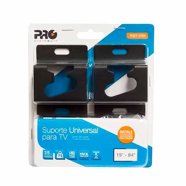 SUPORTE PARA TV PROLETRONIC UNIVERSAL FIXO 15'' A 84'' - PQST-1584 Avaliação: SKU.: 8785 SUPORTE PARA TV PROLETRONIC UNIVERSAL FIXO 15'' A 84'' - PQST-1584 is available for purchase in increments of 1 Faça Login ou Cadastre-se para comprar Descubra mais sobre A Proeletronic como marca de antenas e produtos para TV Digital você já conhece e sabe da qualidade e tradição. Agora a PRO traz uma linha FLEX de suportes para complementar os acessórios para TV; Pensou em produtos para TV, a resposta é sempre Proeletronic; O suporte é PRO PQST-1584 é ideal para qualquer situação; Principais características: - Instale sua TV de 15" até 84" polegadas com total segurança e garantia; - Produzido em aço resistente a toda prova; - Possui roldanas super resistentes leves, o que dá mobilidade e não danifica a televisão; - Possui apoio para TV, o que proporciona uma fixação e posicionamento correto; Aplicação: - O suporte para TV Universal é ideal para instalação de televisores tela plana em racks, painéis ou paredes; Informações Técnicas: - Referência do modelo: PQST-1584; - Suporte: Para TV de 15" a 84"; - Peso suportado: Até 75 Kg de peso máximo sustentado; - Distância da parede: 3,5 Cm; - Furação padrão VERSA: 800x600; - Material/ Composição: Aço de carbono; - Cor do produto: Preto; Características Código Identificador (SKU) 8785 Garantia do Fabricante 12 meses Modelo PQST-1584 Marca PRO ELETRONIC EAN 7898419493154 NCM 7326.90.90 Origem do Produto Estrangeira Mercado Interno - Adquirida no mercado interno